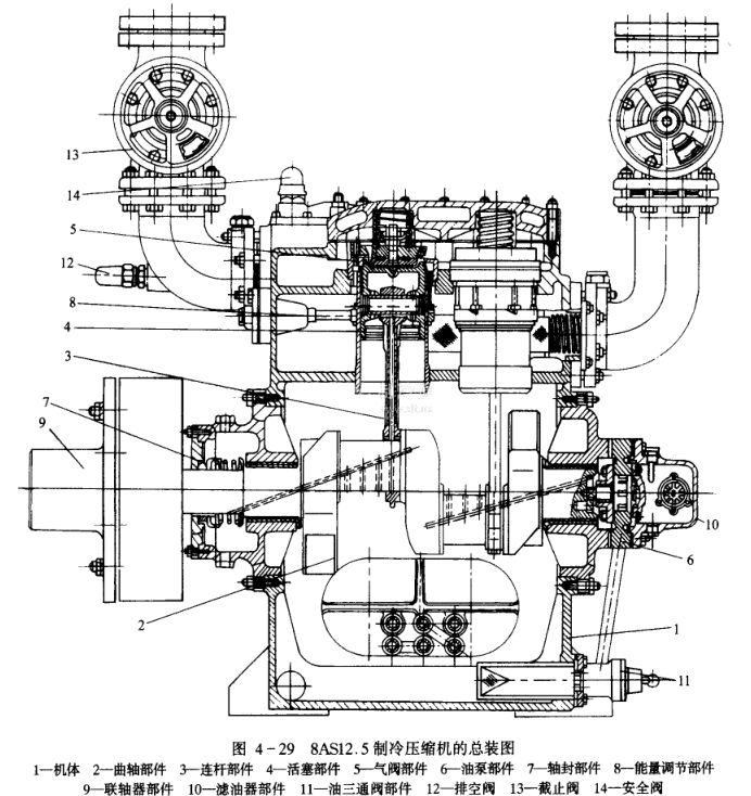 總裝是將已經組裝好的部件和大零件,按一定的順序逐件裝入機體。圖4一29所示為8AS12.5型制冷壓縮機的總裝圖。