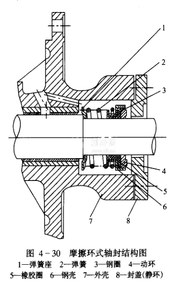 栓。軸封蓋安裝時要注意墊片完好。摩擦環式軸封的結構如圖4一30所示。