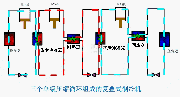 在低溫復疊式制冷系統中、為盡最減少進入系統的冷凍潤滑油,系統設有分油效果良好的油分離器,但并不能避免有少部分冷凍潤滑油進入蒸發器。這是因為低溫系統采用的制冷劑R13, R14都不溶解于油,一且冷凍潤滑油進入蒸發器,不但容易造成油阻塞,影響吸熱,并且很難循環回來,造成壓縮機虧油。為解決這個問題,常常在R13或R14內加入15%(質量分數)的R12,因為R12最容易與油溶解,溶解后還可使油的黏度降低,而且這種混和無任何危險及副作用。