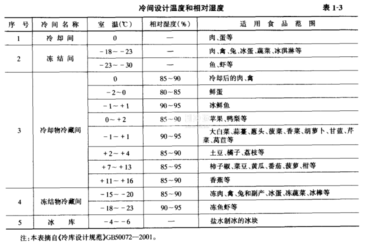 冷庫(kù)貯藏物品種不同,工藝不同,主體建筑的組合也不一樣。各個(gè)冷間功能不同,貯藏食品的品種不同,對(duì)室溫和濕度要求亦不盡相同。詳見(jiàn)表1-3。