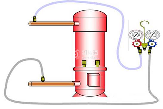 ②把鋼瓶安放在磅秤上,用Ф6×1紫銅管一段,用專制的螺紋一頭接至鋼瓶上,另一頭接到壓縮機吸入效的多用孔道上。接多用孔道螺母暫不扳緊,先把鋼瓶贛開啟一點,隨即又馬上開掉,則把接管內的空氣排凈,然后把螺母旋緊。