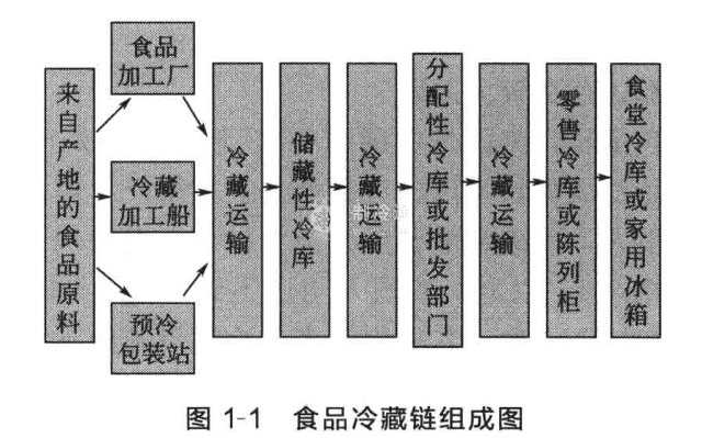 食品冷藏鏈是建立在食品冷凍工藝學的基礎上,以制冷技術為手段,使易腐農產品從生產者到消費者之間的所有環節,即從原料(采摘、捕、收購等環節)、生產、加工、運輸、儲藏、銷售流通的整個過程中,始終保持合適的低溫條件,以保證食品的質量,減少損耗。這種建立在食品冷凍工藝學上的連續低溫環節稱為食品冷藏鏈(Cold Chain),如圖1-1所示。