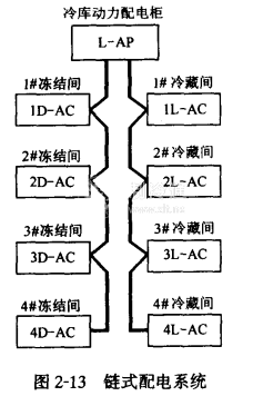 3.鏈式配電 主庫冷間(冷卻、冷凍、冷藏)采用鏈式配電,因為每一冷間設備容量較小,彼此相距很近,且又距離低壓配電室較遠,故采用鏈式配電,每一回路鏈式連接的配電箱(或啟動柜)一般不宜超過5臺。如圖2-13所示。