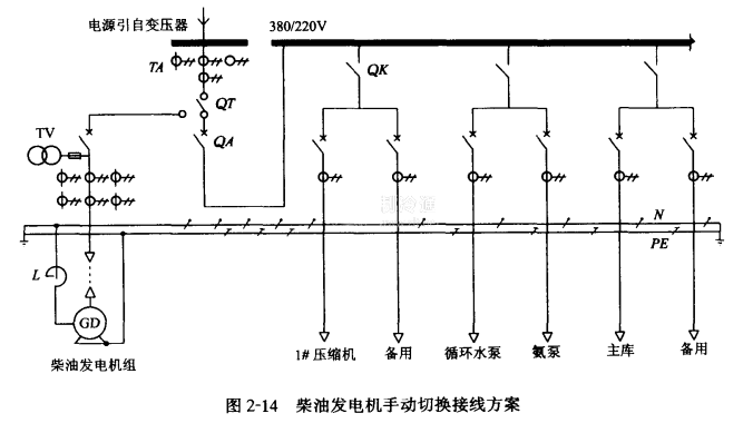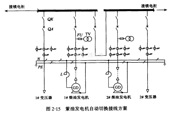 圖2-14為一臺柴油發電機作為備用電源的主接線,當市電停電后,手動切換,接通柴油發電機,當市電停電恢復供電后,手動切除柴油發電機組。