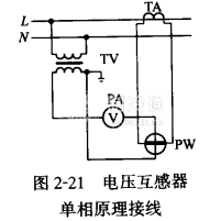 a.采用一個單相電壓互感器的接線,儀表和繼電器接于同一個線電壓上,作為備用電源進線的電壓監視。原理接線如圖2-21所示。