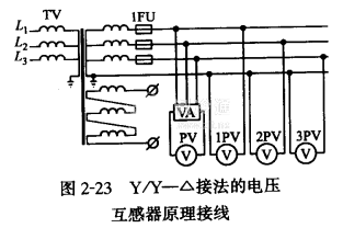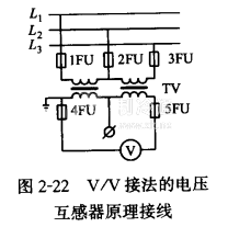 b.采用二個單相電壓互感器接成V形的接線,儀表和繼電器接L1~L2; L2~L3與兩個線電壓,用于主接線較簡單的變配電所。原理接線如圖2-22所示。