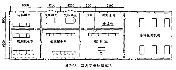 3.雙臺變壓器,有高壓電容器室的室內變電所布置如圖2-26所示。