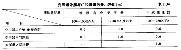 1.確定變壓器室大小時,應考慮有發展的可能,一般按大一級容量變壓器考慮,油浸變壓器外殼與墻壁和門的凈距不應小于表2-34所列出的數值,并應滿足巡視和維修的要求。