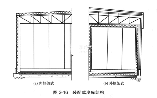 內框架式裝配式冷庫的內框架安裝維修方便,庫內冷風機、排風機、照明燈抖設備安裝容易.框架熱變形小。但冷庫凈容積較小,外墻隔熱預制板受外界氣候條件的影響較大。不得不在庫外增設防雨、防曬等附加設施.外框架式裝配式冷庫的凈容積相對較大.框架自身已有防雨、防曬設施.似外框架維修量較大.庫內設備安裝較困難。