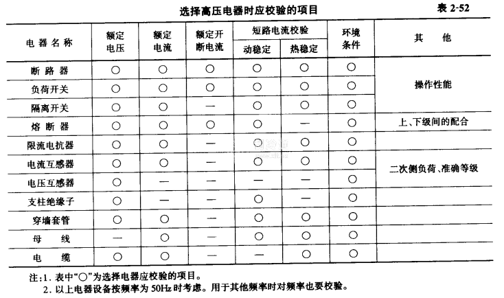 A.短路電流校驗的項目。為了保證高壓電器的可靠運行,除按正常工作情況下的額定電壓、電流、頻率、開斷電流進行選擇外。還應按其在短路情況下所產生的動,熱效應進行校驗,使高壓電器設備在通過最大短路電流時,不致受到嚴重損壞,選擇高壓電器時應校驗的項目見表2-52。