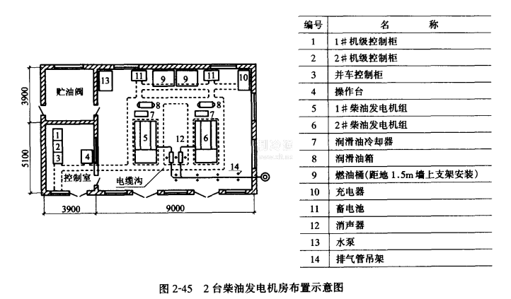 2.圖2-45是二臺320kW柴油發(fā)電機(jī)房的布置示意。該機(jī)房是獨(dú)立建筑,設(shè)有貯油間和控制室。