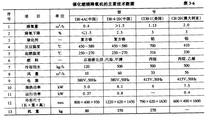 催化燃燒降氧機(jī) 催化燃燒降氧機(jī)是利用催化燃燒反應(yīng),降低庫(kù)內(nèi)空氣中的含氧盤(pán),達(dá)到降氧的目的。主要用于水果和蔬菜的低氧貯藏,即氣調(diào)貯藏。可以達(dá)到長(zhǎng)期保鮮的效果。已知國(guó)內(nèi)外催化燃燒降氧機(jī)的型號(hào)及主要技術(shù)數(shù)據(jù)見(jiàn)表3-6。