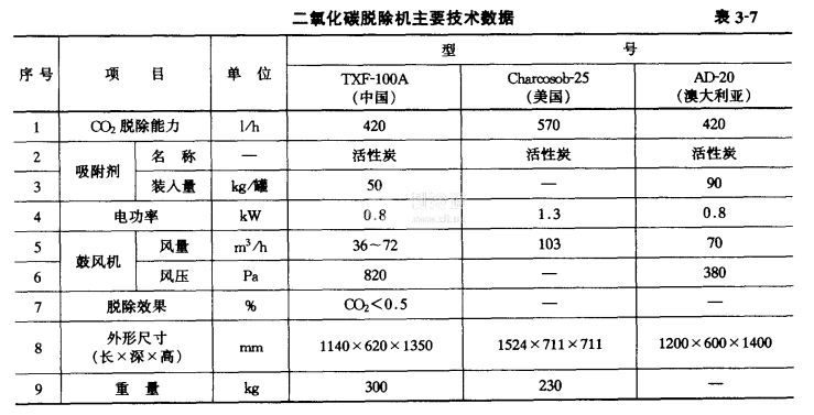 二氧化碳脫除機(jī) 二氧化碳脫除機(jī)是用來(lái)控制氣調(diào)庫(kù)中二氧化碳((o})的濃度,主要用于水果和蔬菜的氣調(diào)貯藏。可以達(dá)到長(zhǎng)期保鮮的效果。已知國(guó)內(nèi)外二氧化碳脫除機(jī)的型號(hào)及主要技術(shù)數(shù)據(jù)見(jiàn)表3-7。