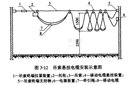 電動葫蘆配電電纜安裝方式 采用移動橡套軟電纜供電。用吊索懸掛移動電纜,其安裝示意圖見圖3-12。吊索材料的選用:跨距在60m以內可采用圓鋼;跨距在60m以上,100m以下選用鋼絲繩。索引繩一般選用旗繩或普通鋼絲繩。移動電纜裝置一般采用滑輪懸掛在鋼索上。移動電纜芯線截面不大于10mm2,其長度應比移動距離大20%,索引繩的長度應比移動電纜稍短。移動電纜的電源裝置應安裝在吊索上沒有螺絲扣的一端。