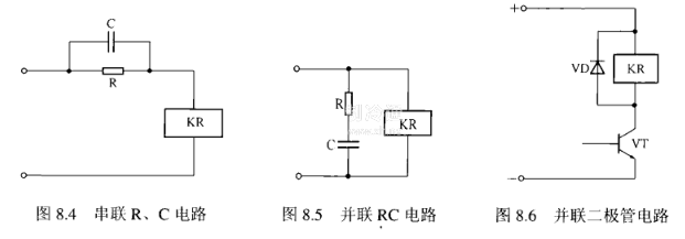 ①串聯R、C電路。如圖8.4所示,當電路閉合的有瞬間,電流可以從電容C通過,使繼電器線圖兩端如上比正常工作電壓高的電壓而迅速吸合,能縮短吸合時間。電流穩定后,電容C不起作用。