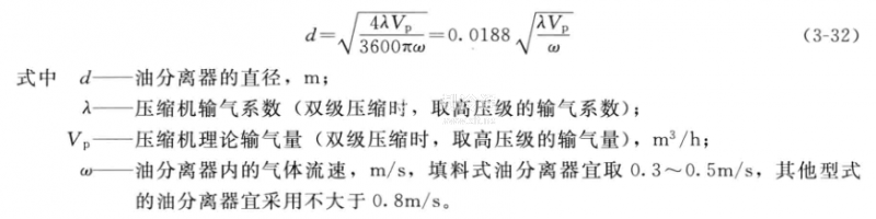 油分離器的選型計算主要是確定油分離器的直徑,以保證制冷劑在油分離器內(nèi)的流速符合分油的要求.從而達到良好的分油效果,其計算公式為: