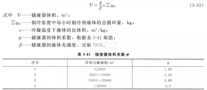 如冷庫有部分蒸發器因生產淡季或檢修而常需抽空時,體積系數可酌情增大一些。對于一些簡易小冷庫,當系統發生故障時會造成全部停產,因此,選擇儲液器應考慮可將系統全部制冷劑回收;船舶制冷裝置,為了保證安全,往往設計成能將全部制冷劑抽回到儲液器儲存。因此,儲液器的總體積應在不大于80%充注量的情況下可容納整個制冷系統的充注量。