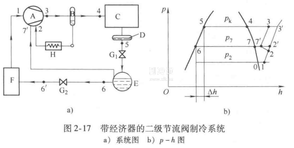 圖2-17a所示為帶經(jīng)濟(jì)器的二級節(jié)流制冷系統(tǒng),來自貯液器D的制冷劑液體,經(jīng)節(jié)流閥G1至經(jīng)濟(jì)器E中,上部產(chǎn)生的閃發(fā)性氣體,通過補(bǔ)氣口進(jìn)入處在壓縮階段的基元容積中,與原有氣體混合繼續(xù)被壓縮;下部的液體經(jīng)節(jié)流閥G1第二次節(jié)流后,進(jìn)入蒸發(fā)器下中制冷。進(jìn)入蒸發(fā)器的制冷劑液體,經(jīng)過二次節(jié)流,且二次節(jié)流前與進(jìn)入補(bǔ)氣口的氣體溫度相同。無論是一次節(jié)流還是二次節(jié)流,都是使進(jìn)入蒸發(fā)器的制冷劑過冷,因而制冷量增加。同時補(bǔ)氣后使基元容積中氣體質(zhì)量增加,壓縮功也有一定的增大,但增大速率比制冷量增加得慢,所以制冷系數(shù)提高,具有節(jié)能的效果。節(jié)能效益的大小與制冷劑的性質(zhì)及工況有關(guān),用R502最好,其次是R12及R22,而R717最差;低溫工況下的節(jié)能效果十分顯著,當(dāng)冷凝溫度不變,落發(fā)溫度越低時,其循環(huán)的制冷系數(shù)提高得越多。其系統(tǒng)的壓-焓(即P-h關(guān))圖如圖2-17b所示。