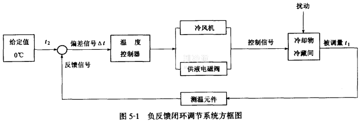 B.負反饋閉環(huán)調(diào)節(jié)系統(tǒng)的特點:如圖5-1所示,是一個冷卻物冷藏間的溫度負反饋閉環(huán)調(diào)節(jié)系統(tǒng)方框圖。給定值0℃是系統(tǒng)的輸入量(t2),而偏差值就是輸出量(t 1) ,輸出量的數(shù)值是鉑熱電阻所檢測出的庫溫(被調(diào)量)與輸入量相減所得的數(shù)值。溫度控制器是調(diào)節(jié)器。冷風機和供液電磁閥是調(diào)節(jié)執(zhí)行機構(gòu)。冷間是室溫的調(diào)節(jié)對象。若鉑熱電阻所檢測出的庫溫(被調(diào)量)t1=1℃反饋到輸入端,其偏差值為: