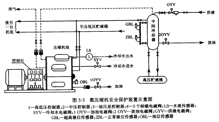 活塞式氨壓縮機的安全保護裝置一般有以下6項,其安裝位置如圖5-3所示。