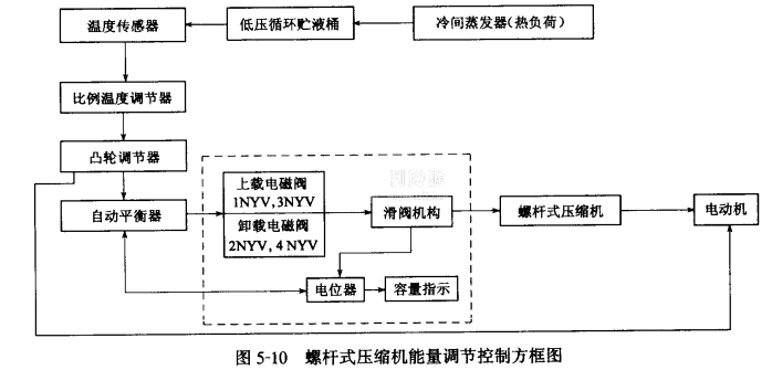 圖5-10所示的控制方框圖是根據(jù)蒸發(fā)溫度調(diào)節(jié),由比例溫度調(diào)節(jié)器、凸輪調(diào)節(jié)器、自動平衡器、壓縮機能量調(diào)節(jié)機構(gòu)組成反饋比例控制電路,當(dāng)安裝在低壓循環(huán)貯液桶的底部溫度傳感器BT檢測的溫度信號傳遞到比例溫度調(diào)節(jié)器與給定值比較后發(fā)生偏差,若實測溫度大于給定值,則由比例溫度調(diào)節(jié)器向凸輪調(diào)節(jié)器發(fā)出增加負(fù)荷信號,使凸輪調(diào)節(jié)器開始向右旋轉(zhuǎn),旋轉(zhuǎn)的幅度受比例溫度調(diào)節(jié)器反饋電路的偏差值的控制,同時凸輪調(diào)節(jié)器內(nèi)的反饋電位器移位變值,引起自動平衡器的電橋電路不平衡,使1NYV,3NYV上載電磁閥得電,推動滑閥向排氣口移動,增加壓縮機輸出能量。直至壓縮機輸出能量與熱負(fù)荷平衡為止。