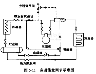 旁通能量調節適用于自身不帶卸載機構的小型制冷壓縮機。采用一個旁通能量調節閥實現壓縮機的能量調節,如圖5-11所示。旁通能盤調節閥是一種閥后恒壓閥。當制冷裝置熱負荷減少,壓縮機吸氣壓力下降至設定值時,于是旁通能量調節閥開啟,吸氣壓力越低,悶的開啟度就越大。將壓縮機排出的部分熱氨氣體自動回流到低壓側吸氣管,用于補償因負荷減少的蒸發器回氣量。以保持壓縮機連續運行所必須的最低吸氣壓力。使壓縮機的制冷量與蒸發器的實際負荷相適應,從而達到能量調節的目的。