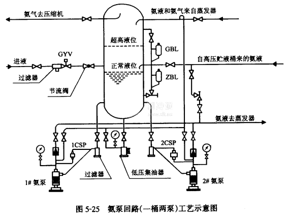 1.氨泵及液位回路的工藝要求,以BKX-12Z氨泵控制箱(一桶兩泵)為例。工藝示意圖如圖5-25所示。圖上自控元件有ZBL和GBL浮球液位控制器閥體(液位傳感器)各1個,GYV供液電磁主閥1個,差壓控制器2個及氨泵與電氣有關。節流閥、止回閥、自動旁通閥等閥門,屬機械閥類,與電氣無關。