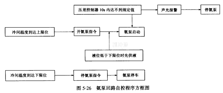 2.氨泵回路的制冷白控程序方框圖見圖5-26。液位控制方框圖與圖5-23相同。