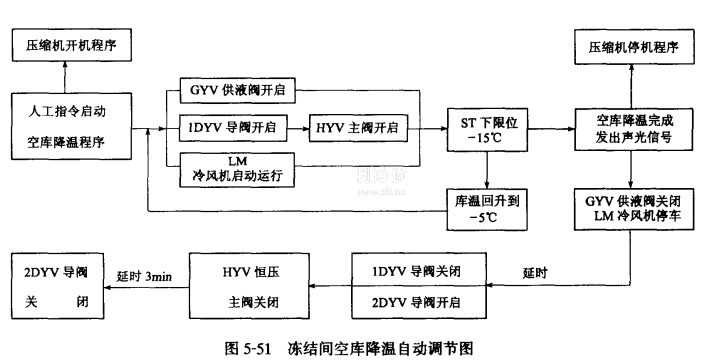 空庫降溫控制程序方框圖如圖5-51所示。當開始空庫降溫時,人工指令,接通GYV供液電磁主閥和IDYV導閥的電源,使其開啟。LM冷風機啟動運行。由于IDYV導閥的開啟,將系統壓力導人HYV回氣主閥活塞頂部,從而HYV回氣恒壓主閥開啟,并指令制冷系統設備聯動投人運行。當庫房溫度下降至設定下限值(-10℃~-15℃,具體數值由工藝定)時,ST溫度控制器發出指令,制冷系統停止工作,同時發出聲光信號,告知值班人員空庫降溫完成。食品可以人庫。當溫度上升到-5℃時,ST溫度控制器發出指令時,制冷系統又啟動運行。
