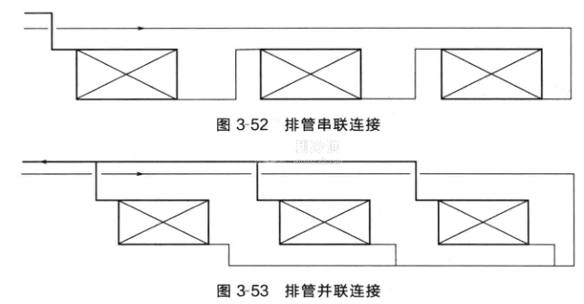 (1)冷卻排管 排管包括頂排管和墻排管。有的庫(kù)內(nèi)同時(shí)設(shè)置頂排管和墻排管;有的庫(kù)內(nèi)只設(shè)置頂排管。墻排管沿著冷庫(kù)的外墻表面設(shè)置,使外墻內(nèi)表面有較低的溫度.使透過(guò)圍護(hù)結(jié)構(gòu)進(jìn)入庫(kù)房的熱量能較快地被冷卻排管所吸收。墻排管的中心位置離庫(kù)地面400mm,防止排管被運(yùn)輸工具和食品碰損。內(nèi)墻表面也可布置墻排管.但必須固定牢靠。在布置多組墻排管時(shí),更要注意供液管對(duì)各組排管的進(jìn)液均勻度.避免液體短路現(xiàn)象。進(jìn)液方法有連續(xù)式,即串聯(lián)連接;有分組式,即并聯(lián)連接.如圖3-52和圖3-53所示。通常采用泵循環(huán)供液方式時(shí).冷卻排管的進(jìn)液用串聯(lián)連接;采用重力供液時(shí).用并聯(lián)連接,同時(shí)應(yīng)采用同程連接方式,即先進(jìn)后出.以免出現(xiàn)液體短路使部分排管供液不足的現(xiàn)象。