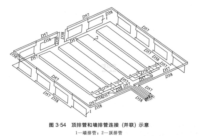 當(dāng)庫(kù)房?jī)?nèi)需要同時(shí)設(shè)置頂排管和墻排管時(shí),特別要注意供液?jiǎn)栴}。一般為頂排管和墻排管分別供液,如圖3-54所示。當(dāng)庫(kù)房較小時(shí)(面積為200~450m2) .可分別供液、合用回氣管;對(duì)于小型冷庫(kù),也用一根管供液、一根管回氣,但必須注意滿足供液均勻的問(wèn)題。