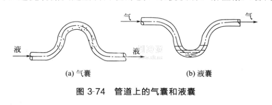 ①在同一標高上管道不應有平面交又,以免形成氣囊和液囊(圖3-74 ),在繞過建筑物的梁時.也不允許形成上下彎。