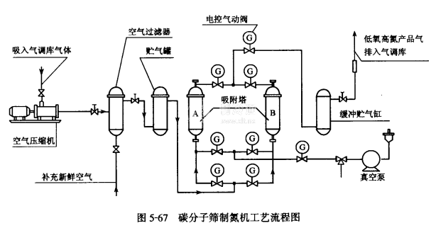 工藝流程如圖5-67所示,氣調庫內氣體由空氣壓縮機的進口吸入,壓縮后經空氣過濾器過池,進入貯氣罐,由貯氣管進入A吸附塔內,塔內充填的碳分子篩將氧氣吸附后,產生低氧高氮的產品氣體,由塔頂排出經緩沖貯氣族送至氣調庫。在A吸附塔產氮的同時,B吸附塔由真空泵減壓,吸附在碳分子篩上的氧氣被脫附下來,排放到大氣中,使塔內碳分子篩再生恢復吸附能力,兩塔交替工作,可連續獲得低氧高氮產品氣。交替工作過程,由時間程序控制器或微處理機程控,自動控制電動閥門的啟閉來完成。