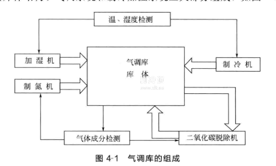 氣調冷庫又稱氣調儲藏庫.是當今最先進的果蔬保鮮儲藏冷庫。它是在冷藏保鮮的基礎上,增加氣體成分調節.通過對儲藏環境中溫度、濕度、二氧化碳、氧氣濃度和乙烯濃度等條件的控制.抑制果蔬呼吸作用,延緩其新陳代謝過程.更好地保持果蔬新鮮度和商品性,延長果蔬儲藏期和銷售貨架期。通常氣調儲藏比普通冷藏可延長儲藏期2-3倍。一座完整的氣調庫主要由庫體結構、氣調系統和制冷加濕系統三大部分組成,如圖4-1所示。