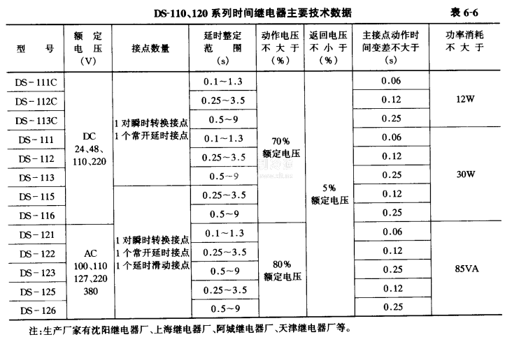 熱穩(wěn)定性: DS-111 C, DS-112C,DS-113C型的線圈能長(zhǎng)期耐110%額定電壓。其他型號(hào)的線圈能耐受110%額定電壓歷時(shí)2min。接點(diǎn)斷開(kāi)容量:在電壓不高于220V,電流不大于1A的直流感性負(fù)荷電路中(時(shí)間常數(shù))主要技術(shù)數(shù)據(jù)見(jiàn)表6-6。時(shí)間常數(shù)不大于5x 10 ̄3s,接點(diǎn)斷開(kāi)功率為100W。