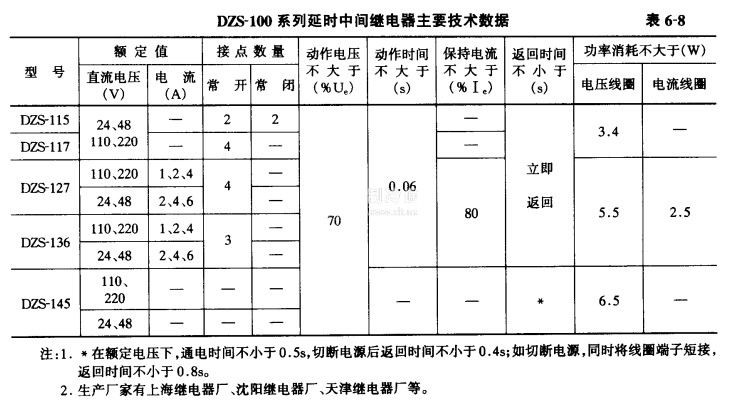 c.DZS-100系列電磁式時(shí)間繼電器:是吸片式電磁延時(shí)中間繼電器,作為輔助繼電器,用于直流操作的保護(hù)回路中,以增加主保護(hù)繼電器的接點(diǎn)數(shù)量或接點(diǎn)容量。DZS-115,DZS-117型繼電器為動(dòng)作延時(shí)繼電器,有1個(gè)工作線圈(電壓線圈)。DZS-145型繼電器為延時(shí)返回繼電器,有1個(gè)工作線圈(電壓線圈)和1個(gè)阻尼線圈。DZS-127,DZS-136型繼電器為延時(shí)電壓動(dòng)作和電流保持的繼電器。有1個(gè)工作線圈(電壓線圈)和兩個(gè)保持線圈(電流線圈)。主要技術(shù)數(shù)據(jù)見(jiàn)表6-8。
