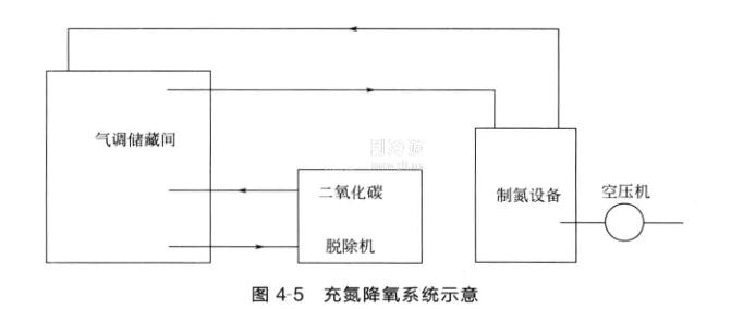 如圖4-5所示為充氮降氧系統示意.其中空氣壓縮機(簡稱空壓機)是制氮機的原料氣源.選擇時應與制氮機的壓力和氣耗相匹配。空壓機分為螺桿式和活塞式兩種。前者工作可靠性高,壓力波動小,但價格較高;后者有一定的壓力波動,但價格較低.工作時,空壓機將壓縮空氣送入制氮設備.空氣被制氮設備分離為富氮氣體和富氧氣體,富氧氣體直接排放到大氣中,富氮氣體用管道送到氣調庫用于降氧。在儲藏過程中,如果庫內二氧化碳濃度過高時,可開啟二氧化碳脫除機脫除二氧化碳。