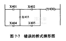 在繼電器有接點控制原理圖中有橋式電路,而梯形圖中不允許出現橋式電路,因為梯形圖中流過的不是物理電流,而是“概念”電流,又稱為“能流”。它是用戶程序執行過程中滿足輸出執行條件的形象表示方式,所以嚴格要求“能流”從左向右流動。遇到圖7-7的情況,要改為圖7-8的形式才能編程。