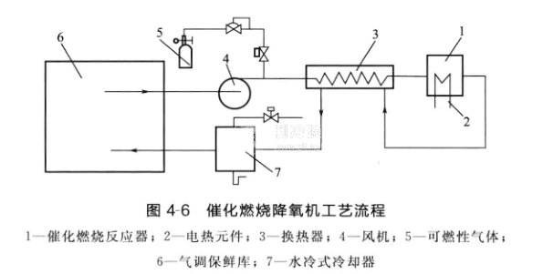 工藝流程催化燃燒降氧機(jī)工藝流程如圖4-6所示.運(yùn)行時(shí).氣調(diào)庫(kù)內(nèi)的氣體通過風(fēng)機(jī)進(jìn)入管道,而丙烷或天然氣燃料按控制的比例也流入管道中,.與庫(kù)內(nèi)氣體混合后,進(jìn)入催化燃燒反應(yīng)器的底部加熱(電熱元件加熱)。在預(yù)熱到反應(yīng)溫度后.混合氣流通過催化劑床層,在催化劑床層內(nèi)發(fā)生催化燃燒反應(yīng),但沒有火焰產(chǎn)生,氧和燃料氣體之間只是放熱反應(yīng),在催化燃燒反應(yīng)時(shí),庫(kù)內(nèi)氣體中的氧氣與燃料中的碳?xì)浠衔锓磻?yīng)生成二氧化碳、水蒸氣和氮?dú)狻H紵蟮母邷貧怏w通過換熱器與燃燒前的混合氣體進(jìn)行換熱而被冷卻,再進(jìn)入水冷式冷卻器.冷卻后被送回到庫(kù)內(nèi)。一般氣調(diào)庫(kù)內(nèi)氣體含氧量降至給定值的5%~10%時(shí).催化燃燒降氧機(jī)即停止工作。