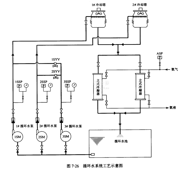 例如某冷庫循環水泵房內有3臺循環水泵,機房屋頂安裝兩臺冷卻塔。工藝示意圖如圖7-26所示。冷凝器進氣管上安裝有ASP壓力控制器,控制冷凝壓力。循環水泵出水管上分別安裝有1SSP,2SSP,3SSP壓力控制器,作為循環水泵安全保護。給水管上安裝有1SYV和2SYV電磁閥作為備用泵投入時管路切換。