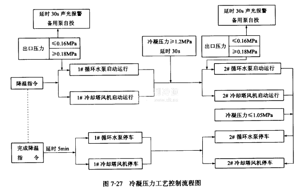 1 SSP-3SSP壓力控制器分別保護1#-3#循環水泵,當水泵啟動后出水管無水,出口壓力小于0.16MPa時,則相應的SSP壓力控制器下限位觸頭吸合,延時30s后聲光報普,水泵自動停車,備用循環水泵自動投入運行。如出口壓力)0.18MPa時,則相應的SSP壓力控制器上限位觸頭吸合,循環水泵正常運行。工藝流程如圖7-27所示。