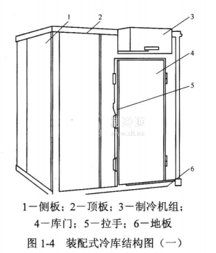 裝配庫的庫體采用工廠按標準模數生產的底板、側板、頂板、庫門等組裝而成,如圖1-4至圖1-6所示,裝配庫可按庫板模數改變組裝尺寸,根據需要搭配組合,適應性強,容易裝、拆搬遷,為活動性冷庫,裝配庫按庫容量大小分別配有全套的制冷機器和設備。