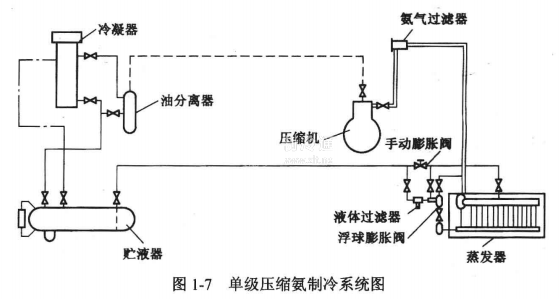 1.氨制冷系統(tǒng):大多數(shù)冷庫采用。單級(jí)壓縮氨制冷系統(tǒng)圖如圖1-7所示。