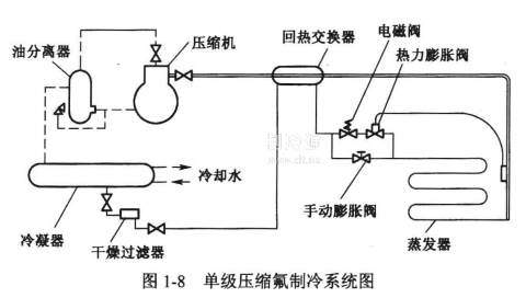 冷凍食品銷售柜及空調(diào)采用。單級(jí)壓縮氟制冷系統(tǒng)圖如圖1-8和圖1-9所示。