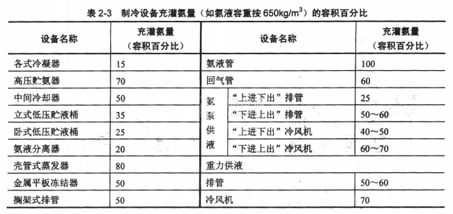2.制冷設(shè)備充灌氨量的容積百分比如表2-3所示。