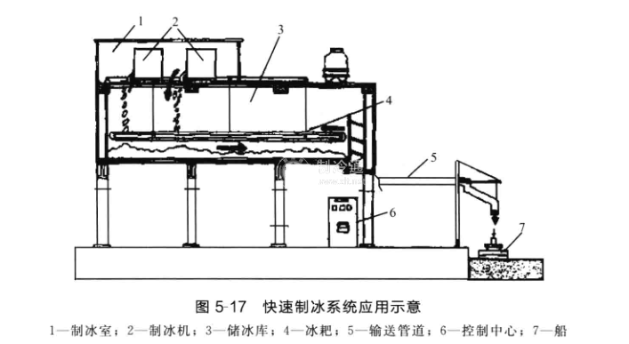 管冰、板冰、片冰和殼冰設備.除了機電一體化的制冰機之外.往往還配套儲冰系統。儲冰系統中,制冰機生產的冰直接進入冰庫。冰庫中可配置冰耙系統.通過稱重、螺旋輸送或氣力輸送系統,把設定需要量的冰直接送至用冰點。這一系列的過程完全是由PLC或電腦控制自動完成的。如圖5-17所示為快速制冷系統應用示意。