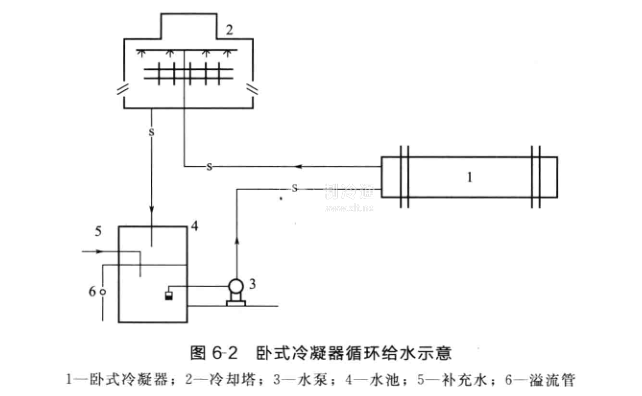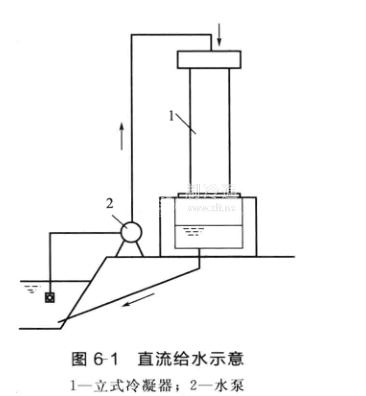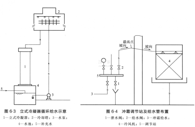 (2)沖霜給水管 沖霜給水管應防止凍堵,在設計時要有相應措施。調節(jié)站至庫房冷風機之間的水平給水管,在進庫房前的坡向為逆流向.再以順流向坡向冷風機,如圖6-4所示。在調節(jié)站上設泄水閥。沖霜結束時,應打開泄水閥1.待給水管中水泄盡后再關閉給水閥2、泄水閥1,若發(fā)生誤操作先關閉給水閥2,再關閉泄水閥I或不開泄水閥I泄水,也不會發(fā)生凍堵現(xiàn)象。