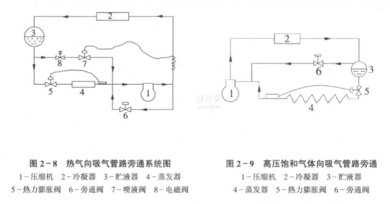 圖2一8所示為壓縮機(jī)排氣直接向吸氣管路旁通循環(huán)的原理圖。在壓縮機(jī)排氣管路與吸氣管路上安裝旁通能最調(diào)節(jié)閥.當(dāng)旁通閥打開時(shí),部分壓縮機(jī)排氣通過旁通閥進(jìn)入吸氣管路。