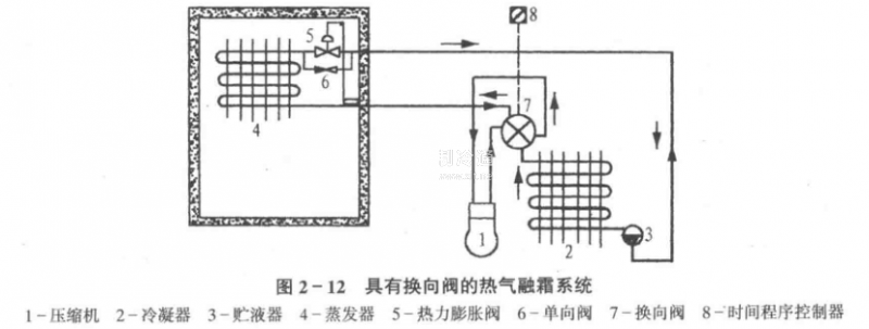 圖2一12所示為通過換向閥進行融霜的系統圖。制冷循環時,壓縮機的排氣進入冷凝器中.冷凝后的液體進入貯液器,經熱力膨脹閥節流降壓后進入蒸發器,制冷劑吸收熱璧后的低壓蒸氣被壓縮機所吸入。融霜時,通過融霜時間控制器控制四通換向閥動作,此時制冷機工作在熱泵狀態。壓縮機的排氣從回氣管路進入到蒸發器中(如圖中管外箭頭所示),在蒸發器中制冷劑高溫氣體放出熱最被凝結為液體,制冷劑放出的熱量使蒸發器外表面的霜層融化,凝結的制冷劑液體經單向閥從制冷劑液體管路流到貯液器和冷凝器中.制冷劑液體在冷凝器中吸收外界環境介質的熱量而蒸發,蒸發的制冷劑蒸氣被壓縮機所吸入。在融霜時制冷系統完成逆向循環,此時冷凝器與蒸發器的作用互換。