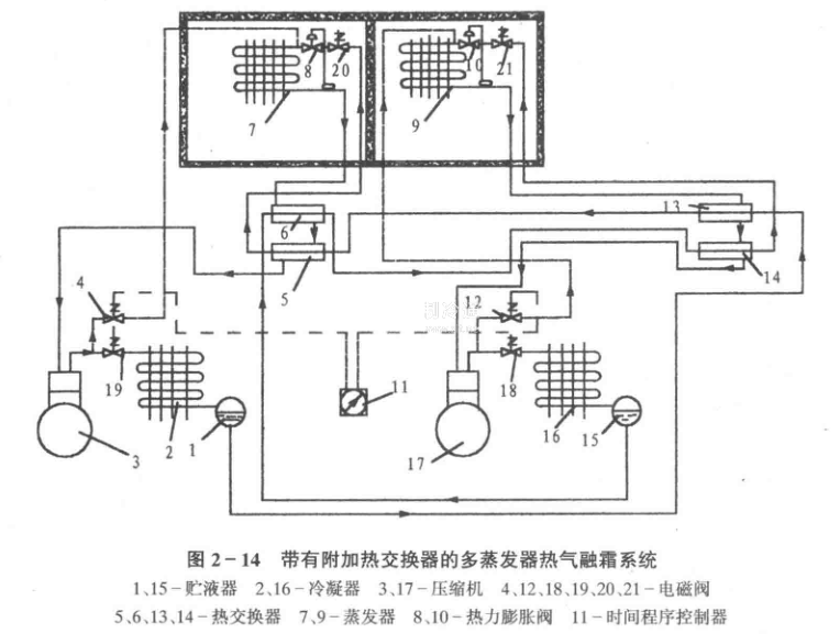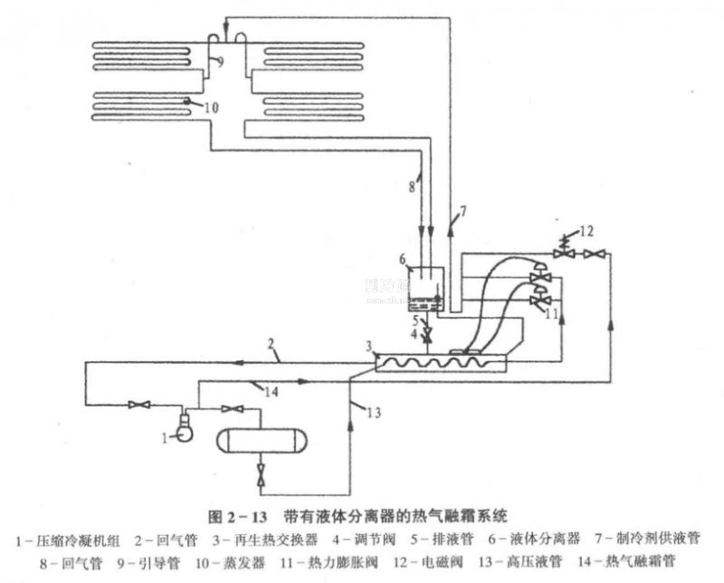 圖2一13為一具有液體分離器的熱氣融霖系統。該系統是一個多蒸發器的制冷組合系統。圖中所表示的是這些蒸發器同時進行融霜時的融貓系統連接情況。系統中采用了一些輔助設備,如液體分離器和再生熱交換器,再生熱交換器在制冷循環時起回熱器的作用。融霜時,電磁閥12開啟,壓縮機的排氣從液體管路進入到蒸發器中,吸收了管外的熱量而冷凝為液體,從蒸發器排出的制冷劑液體,經管路8從蒸發器的回氣管路進入到液體分離器6,液體積存在底部,而蒸氣沿管路進入熱交換器的蒸氣腔,液體沿排液管5經過調節閥進入再生熱交換器3中間部分的蒸氣腔,蒸氣經管路進入到壓縮機中,而液體在熱交換器及回氣管路中吸收熱量蒸發,氣化以后被壓縮機所吸入。在需要融霜時,時間控制器接通電磁閥,壓縮機排出的熱蒸氣的主要部分進入兩組的第一蒸發器中,而其余的蒸氣經過引導管繞過第一蒸發器,進入第二蒸發器中。這樣可以避免進入第二個蒸發器的制冷劑沮度較低,可以縮短融霜循環的持續時間。